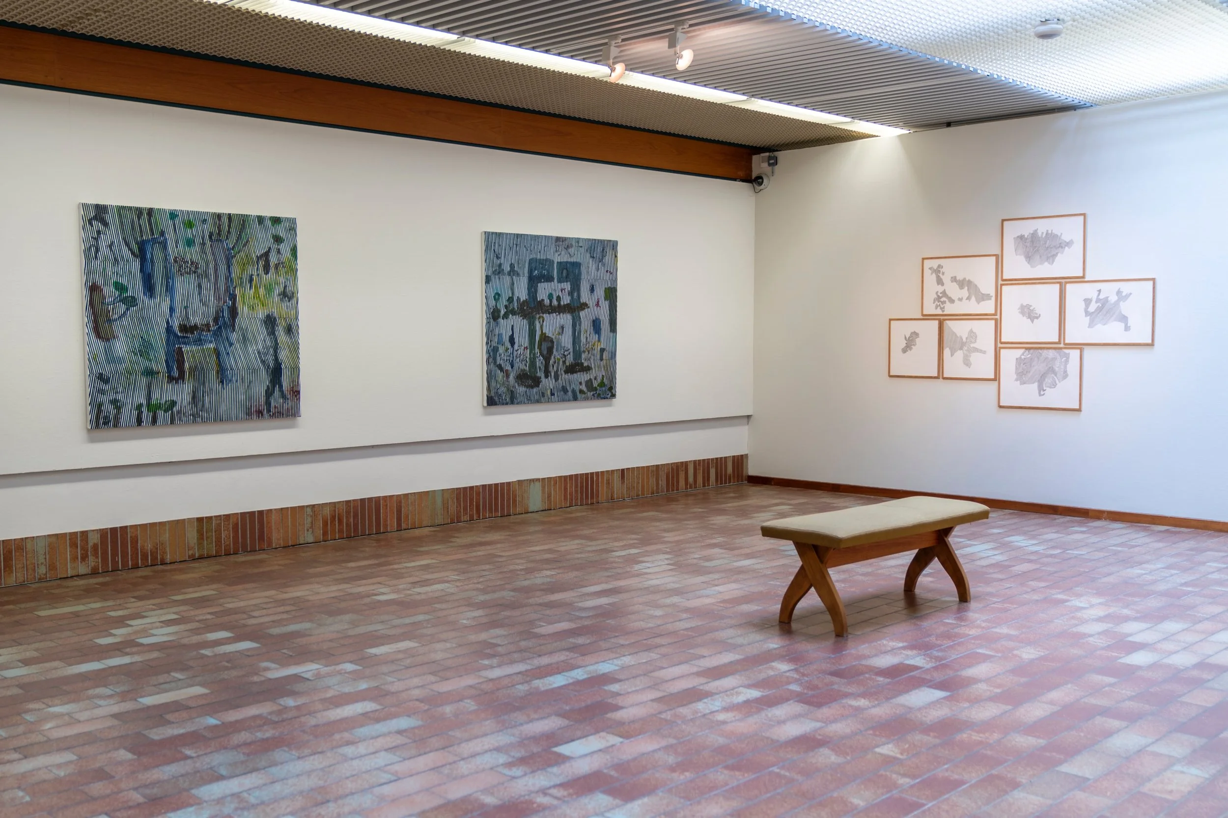 A selection of installation views from the exhibition, alongside detailed studio shots of individual works